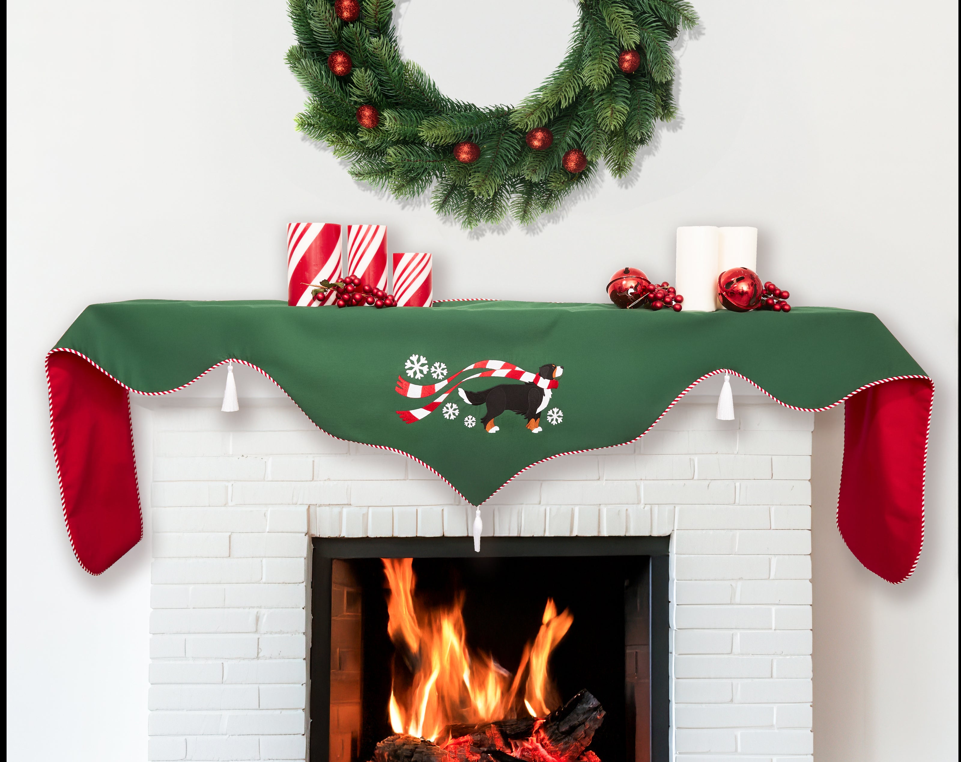 These festive dogs are all wrapped up for the holidays! Choose from 19 breeds, embroidered on pillows, mantel scarves, table runners and tree skirts.