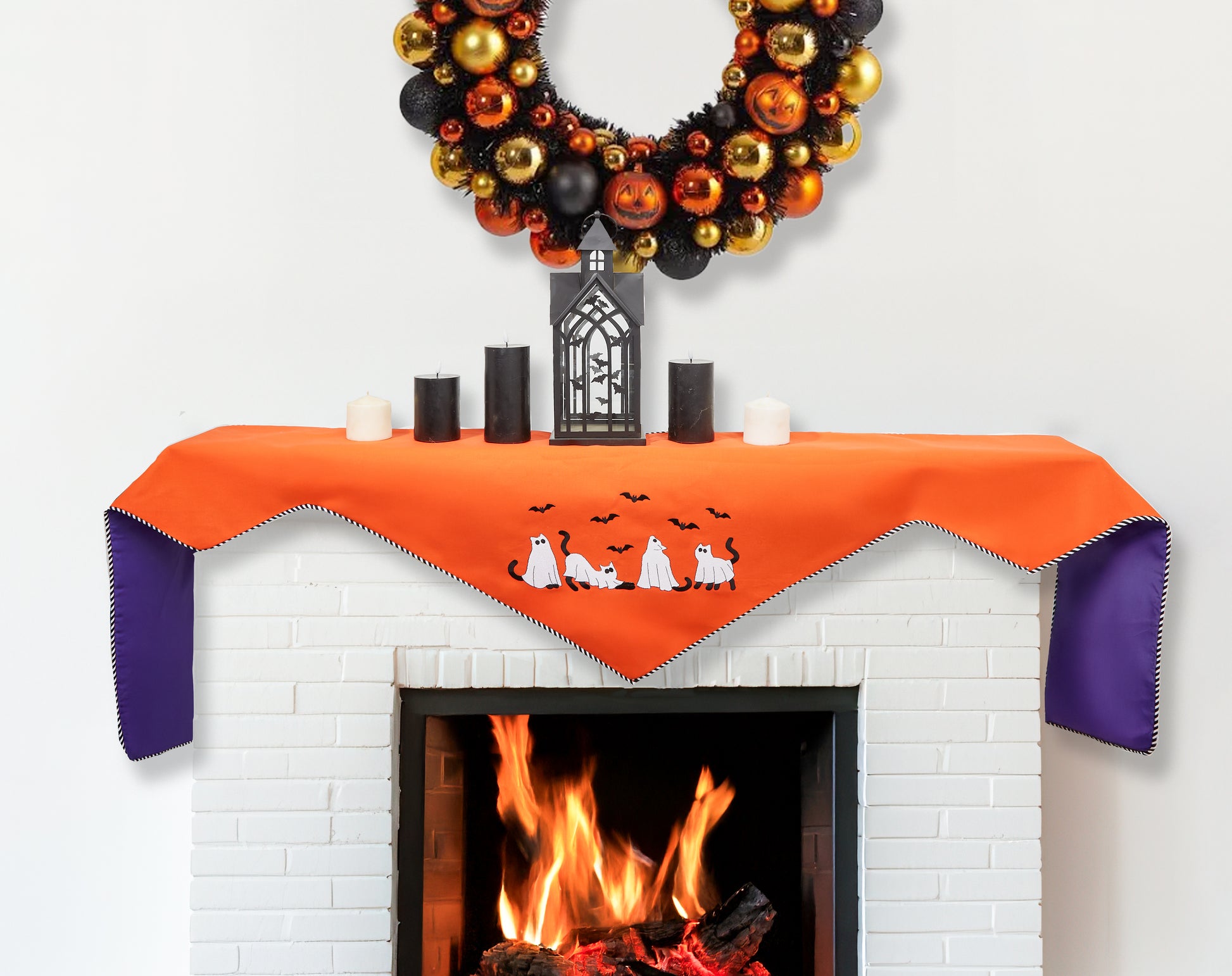 Playful Ghost Cats are embroidered on this cotton canvas mantel scarf. 96” long mantel scarf is lined in purple cotton/poly and edged with black and white piping. Hand waah, line dry.