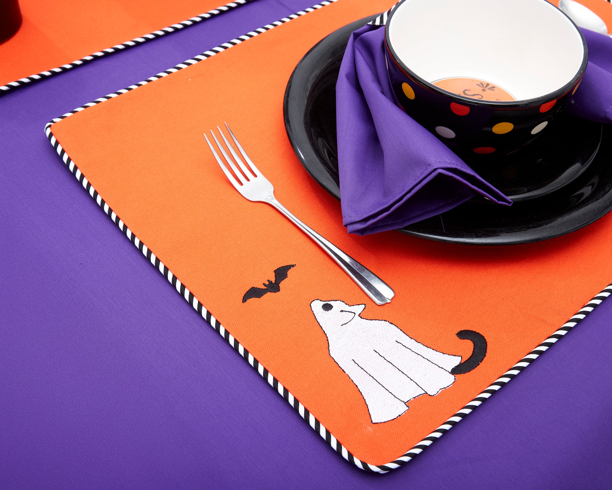 Adorable ghost cats are embroidered on heavy-weight cotton canvas, trimmed with black and white piping. 19” x 14” placemats are machine washable.