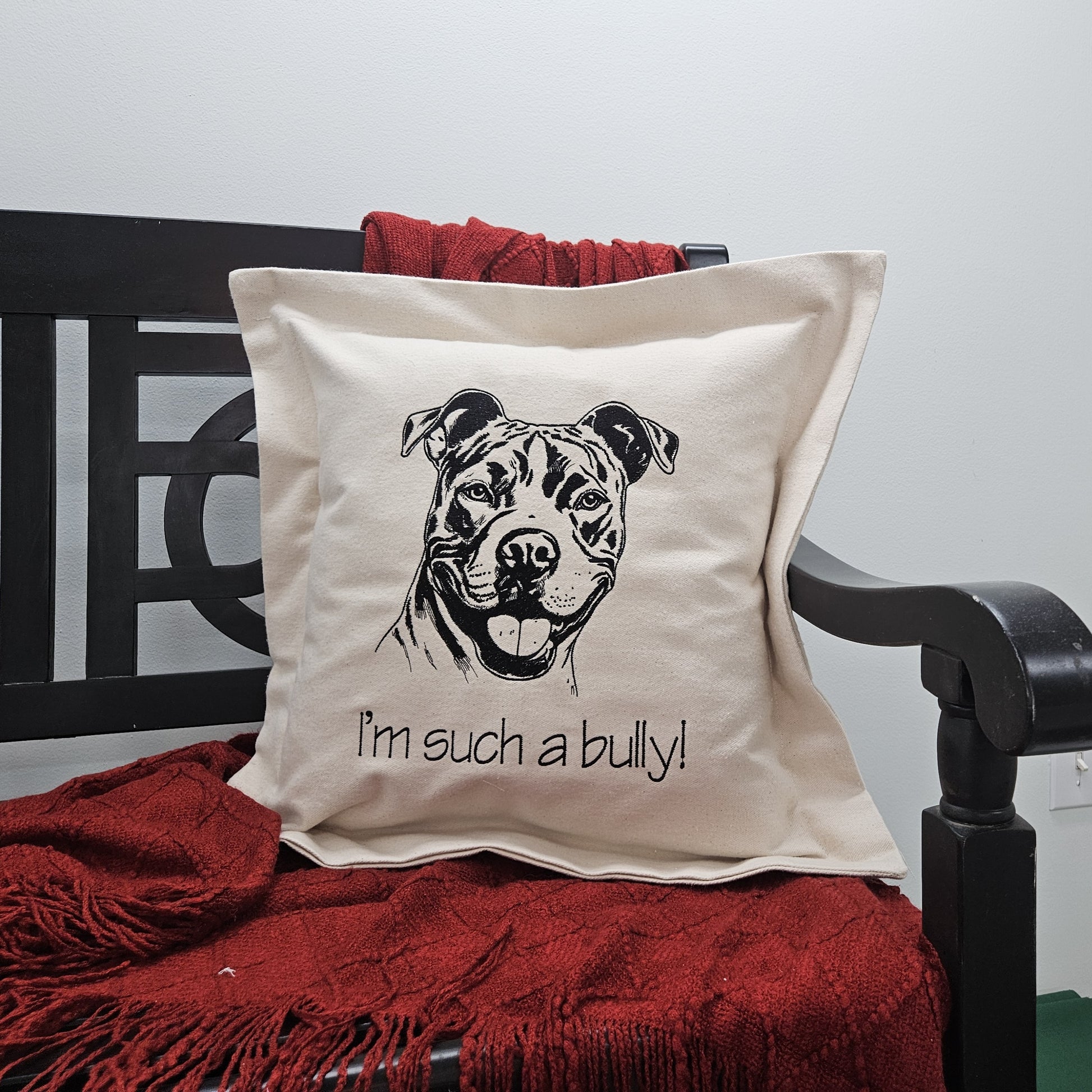 Am I really a bully? I don't think so! This embroidered pillow perfectly captures the sweet look on this Pitty's face. 100% cotton brushed denim is hand washable in cold water; line dry. Overall dimension 22 x 22; holds an 18" insert.