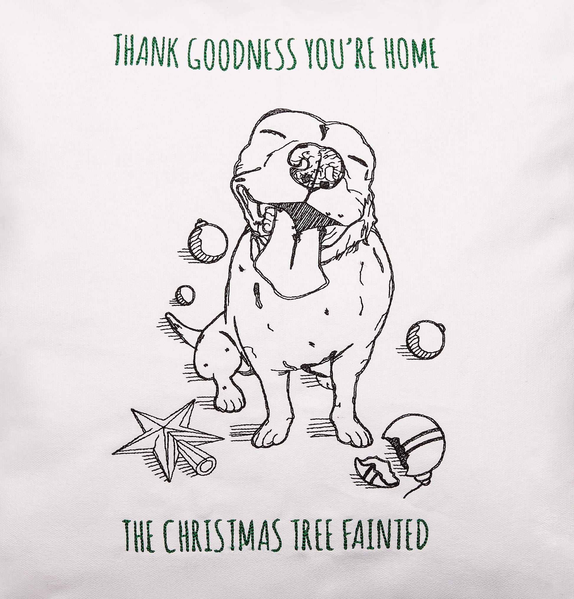 This innocent Pitbull insists it’s not his fault the tree fainted! This fun design is embroidered on heavy-weight cotton canvas and trimmed in candy-cane striped piping.