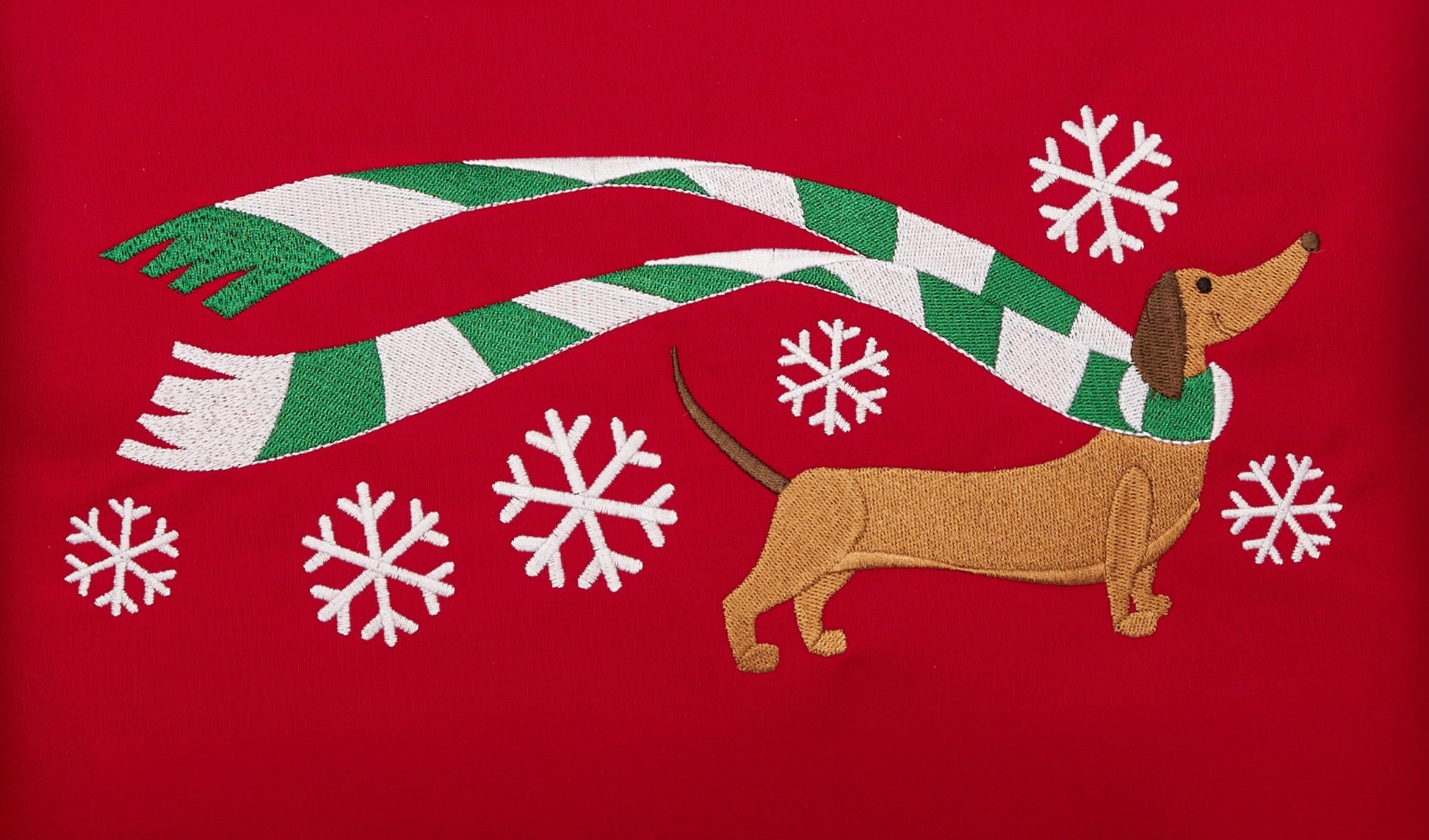 Cheerful pup sports a festive striped scarf on this fun embroidered table runner.